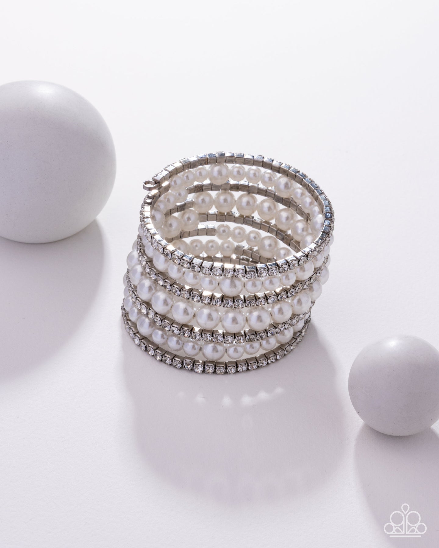 Threaded along a coiled wire, rows of white pearls in varying sizes and white rhinestones in square silver fittings alternate along the wrist, creating an elegant infinity wrap-style bracelet.