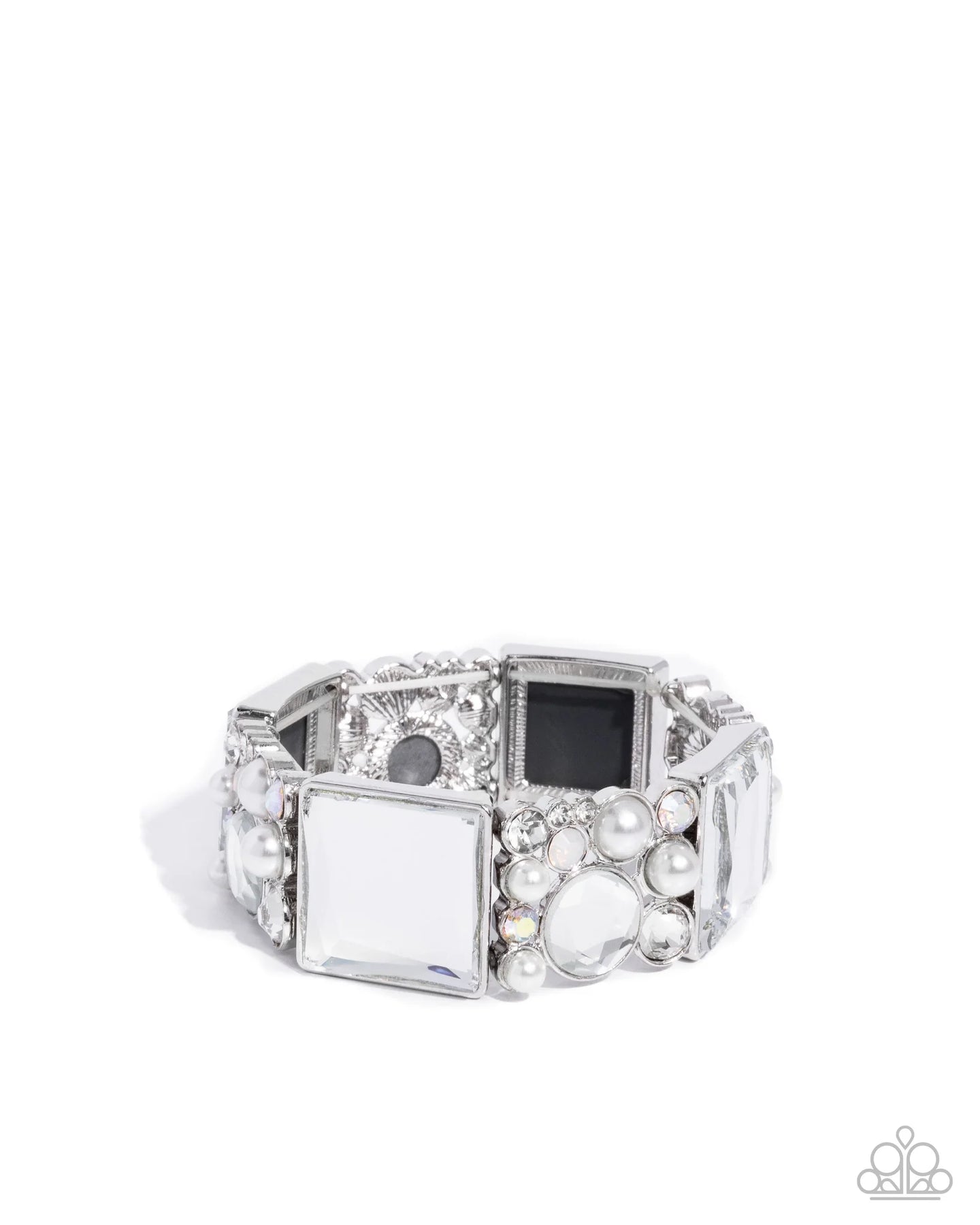 Infused along elastic stretchy bands, elevated faceted clear square gems alternate with clustered framed collections of varying sizes of white pearls, white, iridescent, clear and opalescent gems for a glamorously glittery display. Due to its prismatic palette, color may vary.