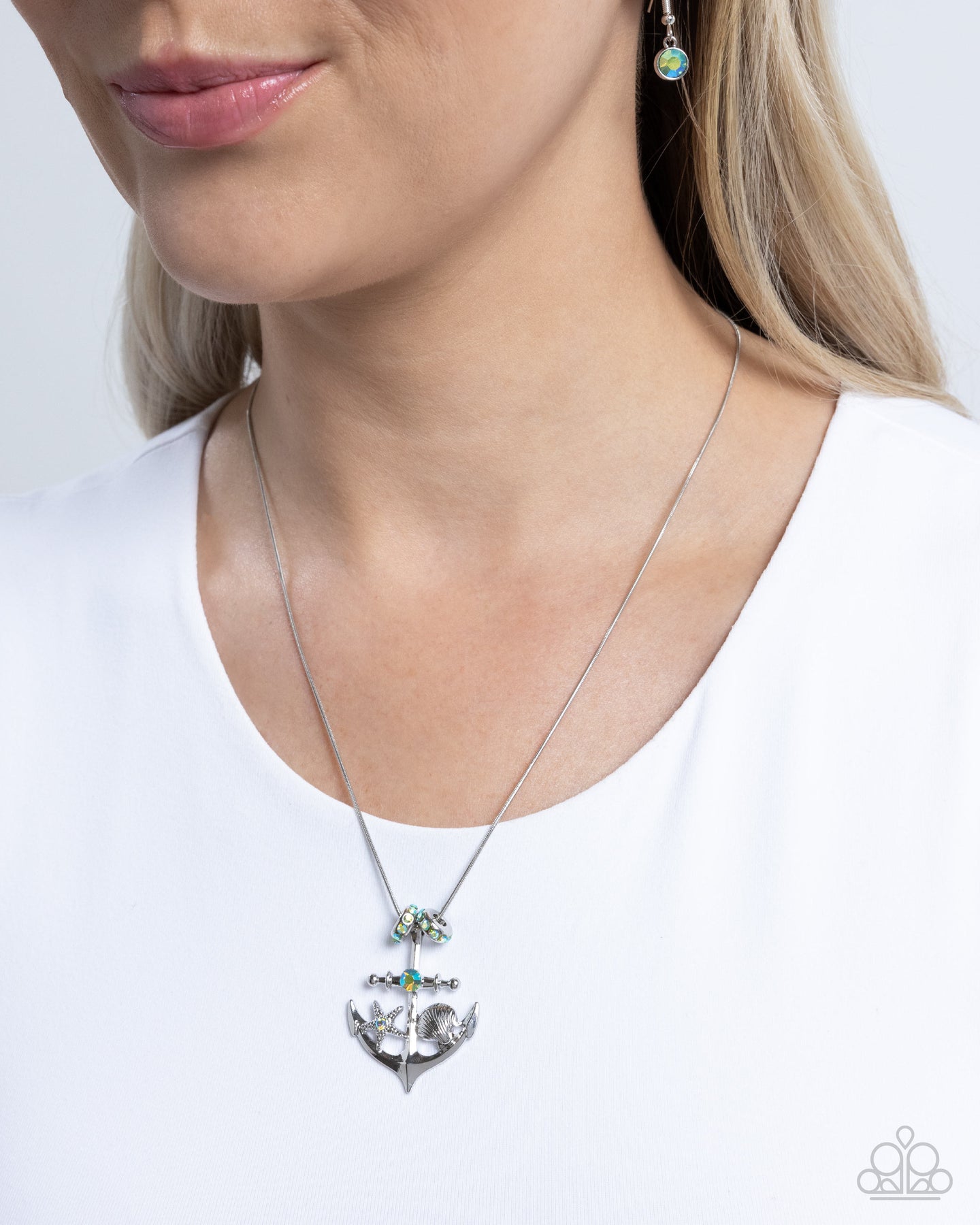 Gliding along a silver snake chain, two light sapphire-embellished silver discs frame a silver anchor pendant also featuring light sapphire rhinestone details. The bottom arms of the anchor feature a textured silver seashell and starfish for additional coastal charm. Features an adjustable clasp closure.