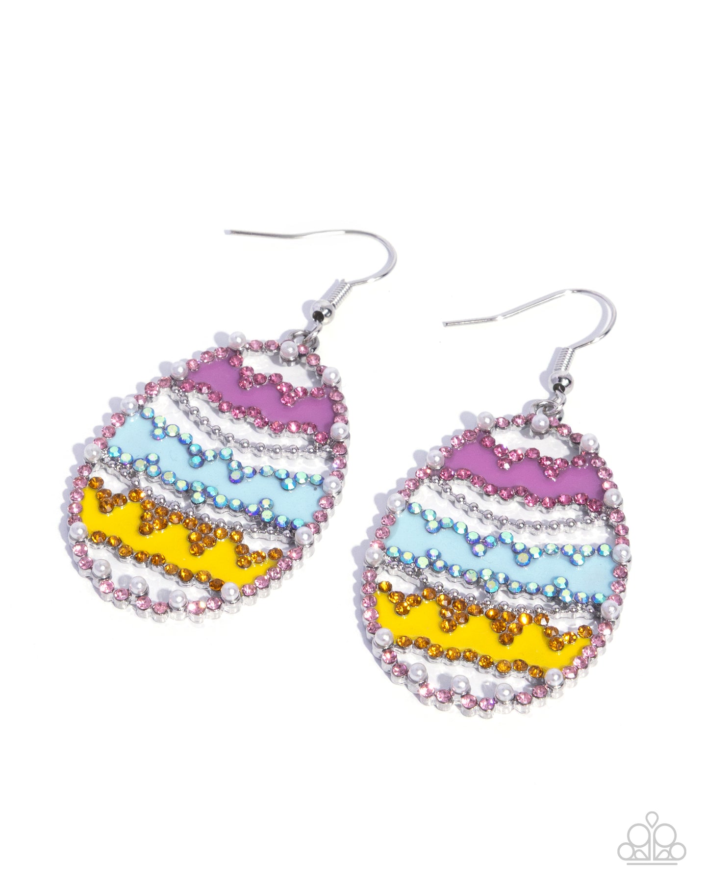 Featuring whimsical details, a collection of light rose, light sapphire, yellow, and light sapphire iridescent rhinestones, glossy white pearls, rows of silver studs, and stripes of purple, blue, and yellow paint is embellished atop airy, oversized, opulent Easter Egg-inspired silver pendants for a splash of Springtime color and shimmer. Earring attaches to a standard fishhook fitting.