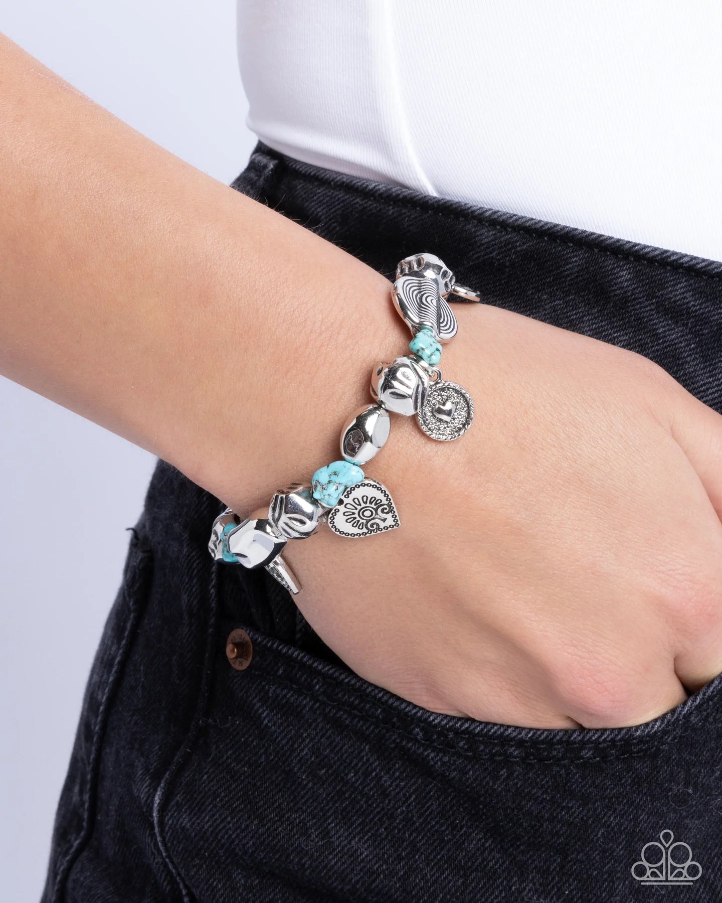 Infused along an elastic stretchy band, a collection of chiseled turquoise stones, abstract textured silver beads, silver spiral beads, and various textured heart charms sway along the wrist for a romantically rustic look. As the stone elements in this piece are natural, some color variation is normal.