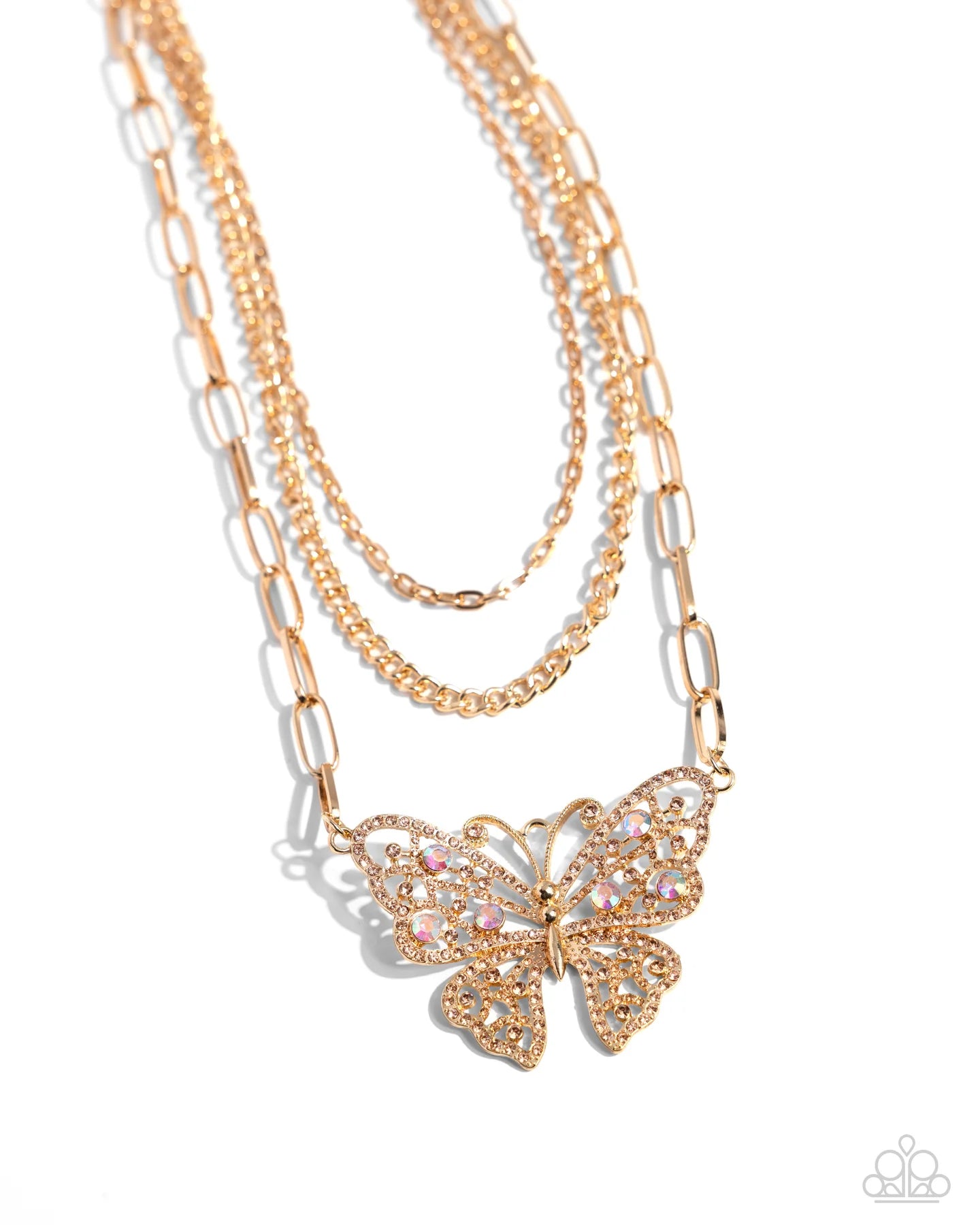 Three mismatched silver chains interlock and cascade around the neckline in endless layers. A light sapphire and light sapphire iridescent-infused silver butterfly flutters at the bottom of the display for a whimsical finish. Features an adjustable clasp closure. Due to its prismatic palette, color may vary.