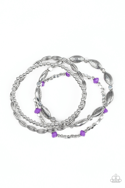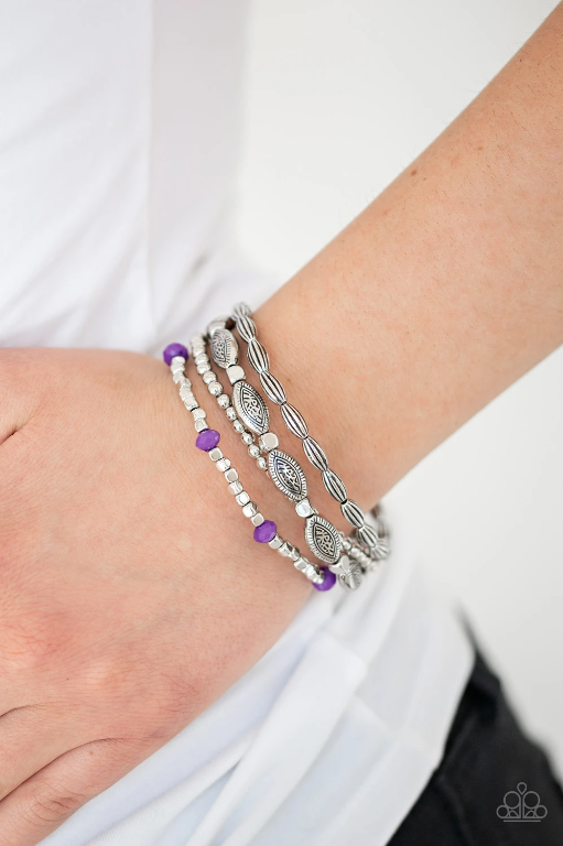 A collection of mismatched silver beads, silver cubes, and faceted purple beads are threaded along four stretchy bands around the wrist for a colorful flair.