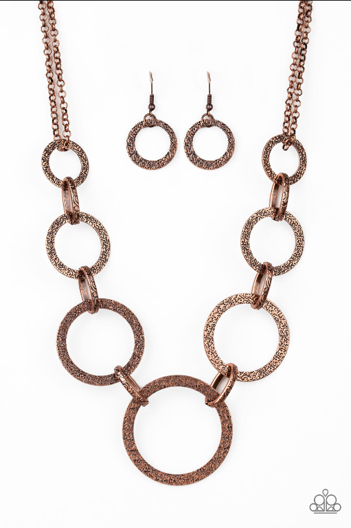 Delicately hammered in antiqued shimmer, glistening copper hoops connect with ornate links below the collar for an edgy look. Features an adjustable clasp closure.