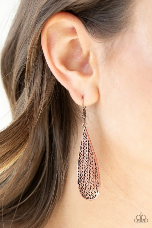 Featuring diamond-like patterns, an antiqued brass teardrop frame swings from the ear for a tribal inspired look. Earring attaches to a standard fishhook fitting.
