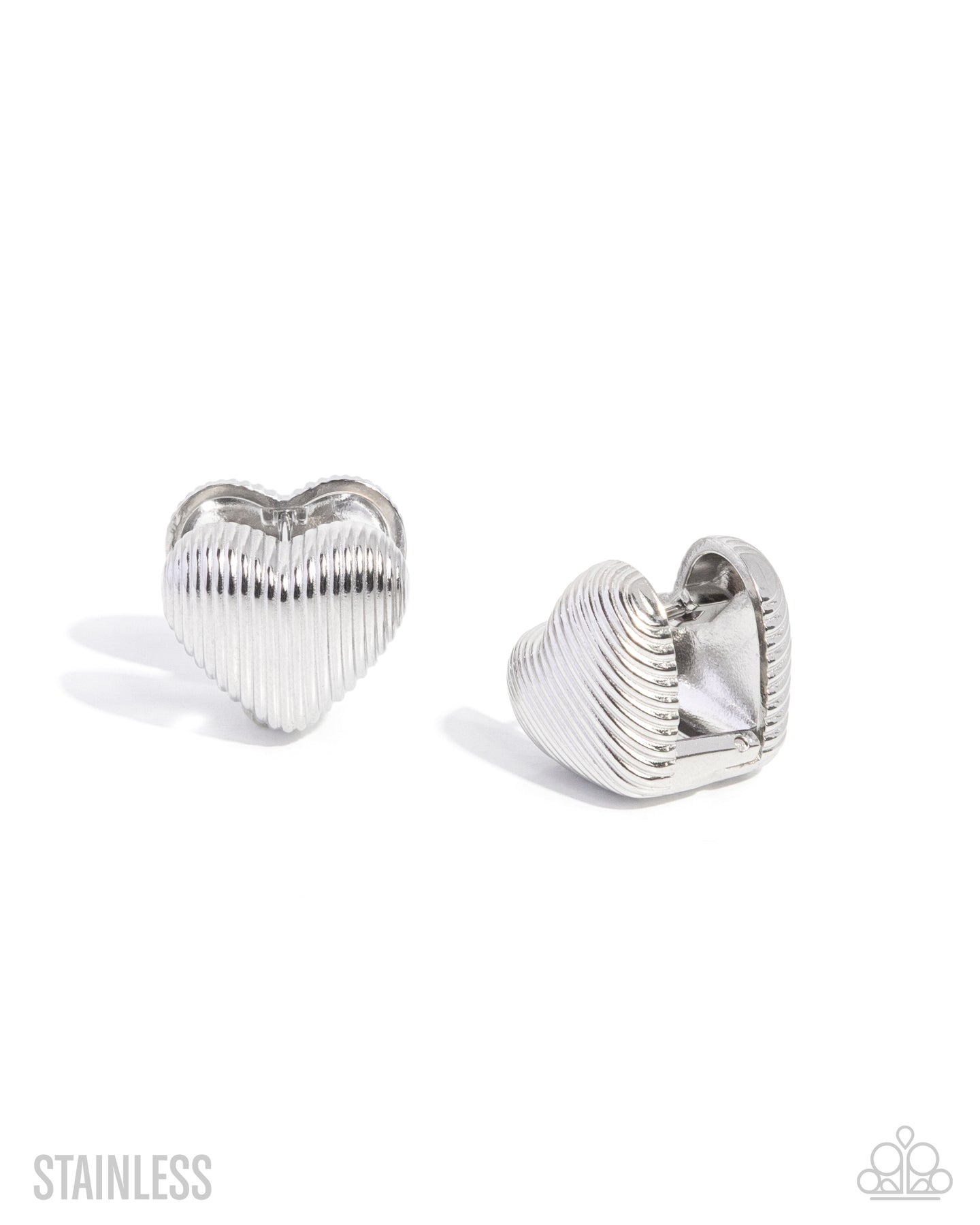 Featuring stainless steel, a glistening ribbed silver heart opens around the ear for a chic, cupid-inspired display. Earring attaches to a standard hinge closure fitting. Hoop measures approximately 1/2" in diameter.