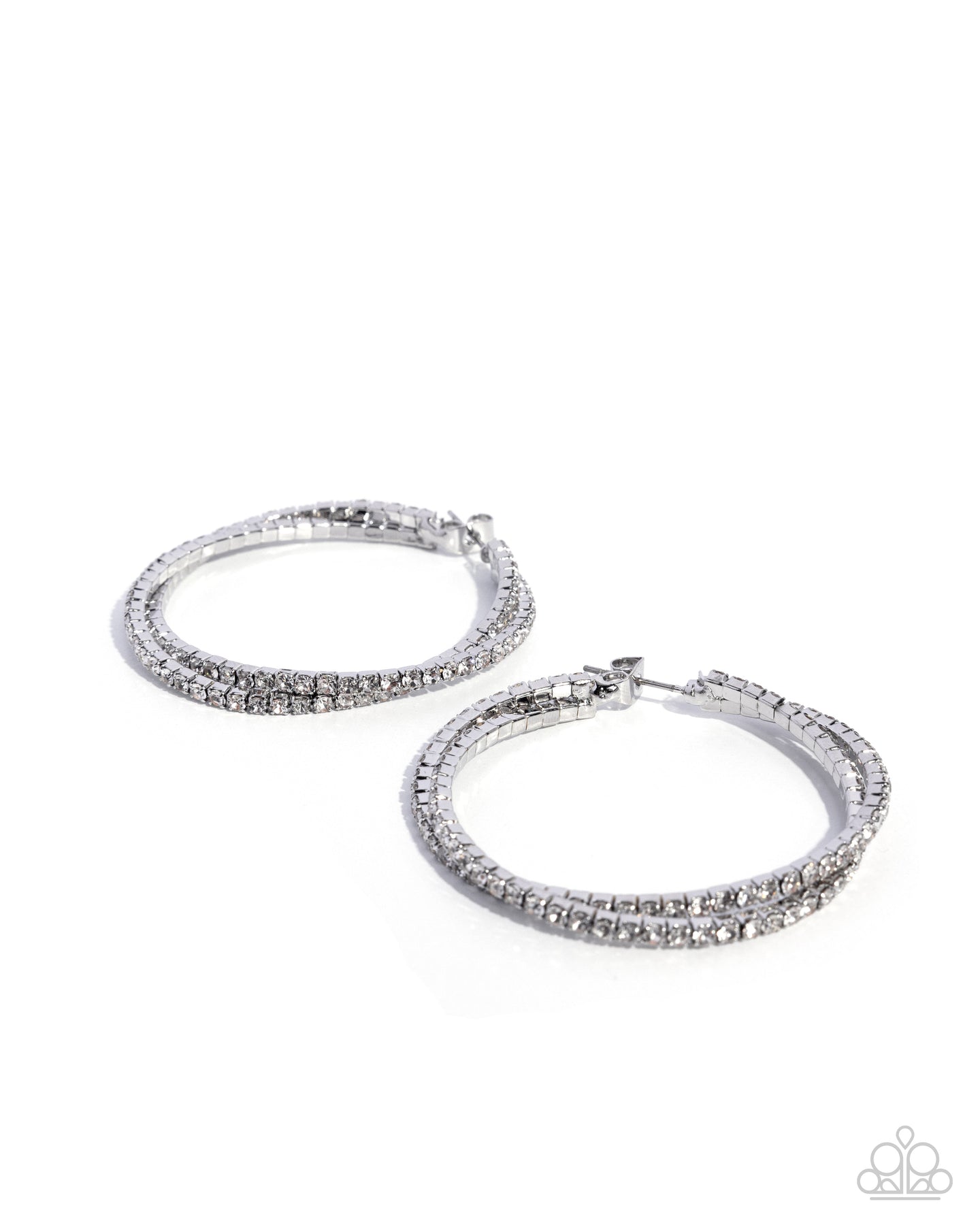 Pressed in silver square fittings, a collection of glistening white rhinestones curls below the ear in stacks for a layered, luminescent look. Earring attaches to a standard post fitting. Hoop measures approximately 1 3/4" in diameter.