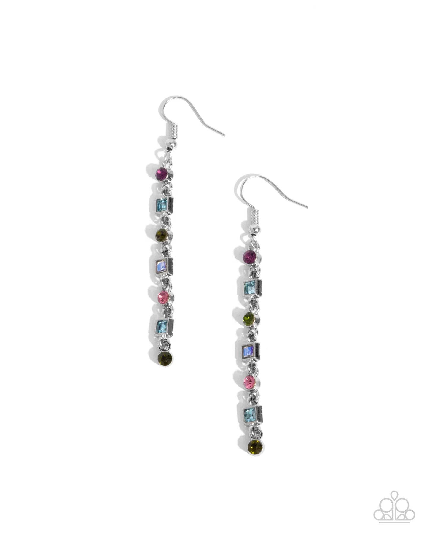 Pressed in silver squares, multicolored rhinestones alternate with round multicolored rhinestones, trickling from the ear into an elongated glamorous lure. Earring attaches to a standard fishhook fitting.
