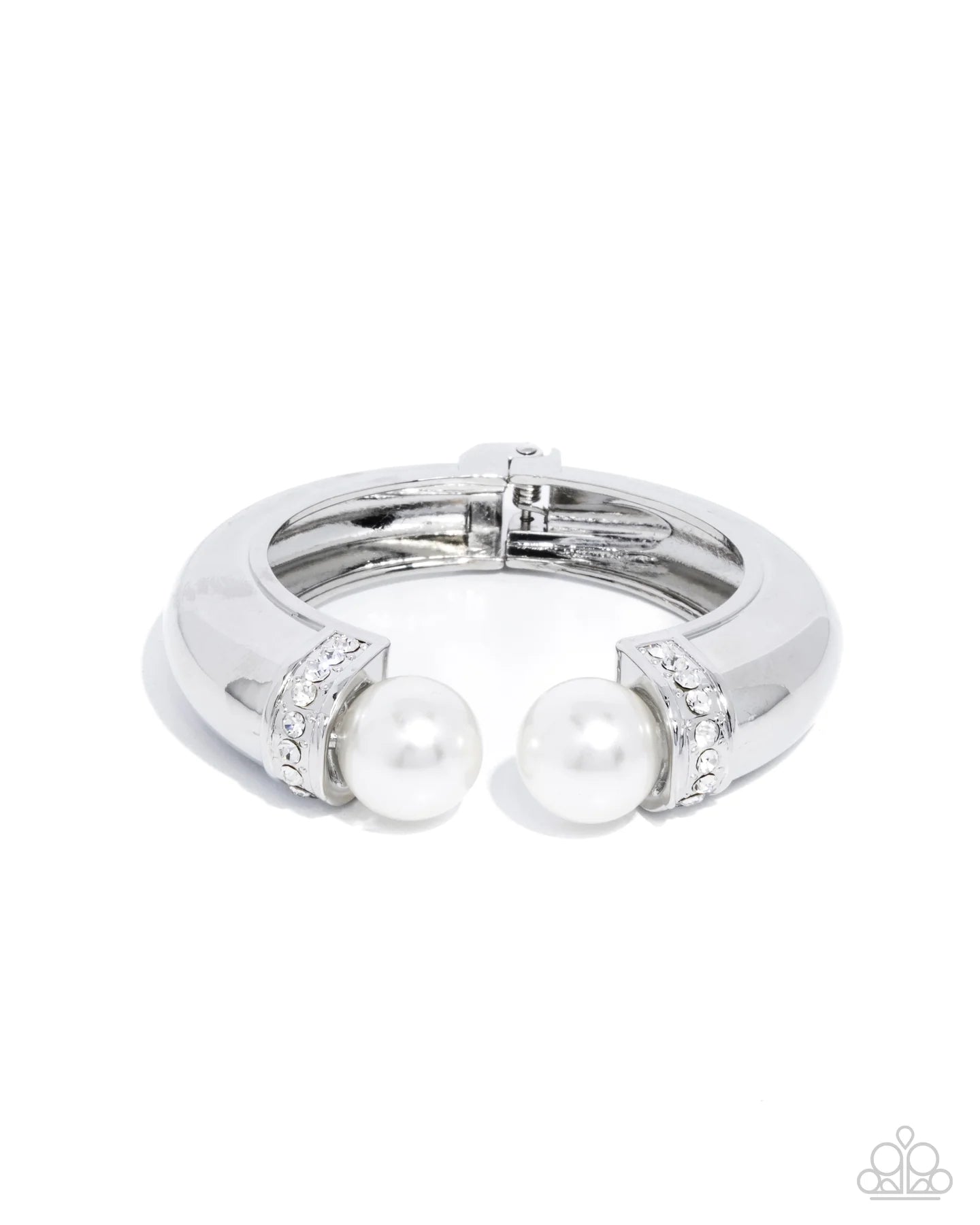 Two dramatically glossy white pearls are nestled at the ends of a white rhinestone embellished gold cuff, creating an elegant statement piece that wraps boldly around the wrist. Features a hinged closure.