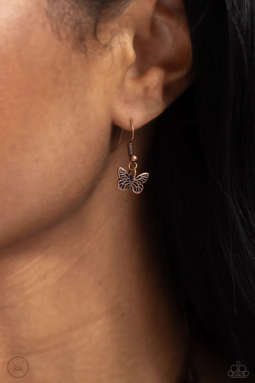 Floating along a dainty copper chain, a collection of ornate copper butterflies coalesces down the neckline for a whimsical finish. A larger copper butterfly, featuring the same ornate detail swings below the fluttering collection for a layered display. Features an adjustable clasp closure.