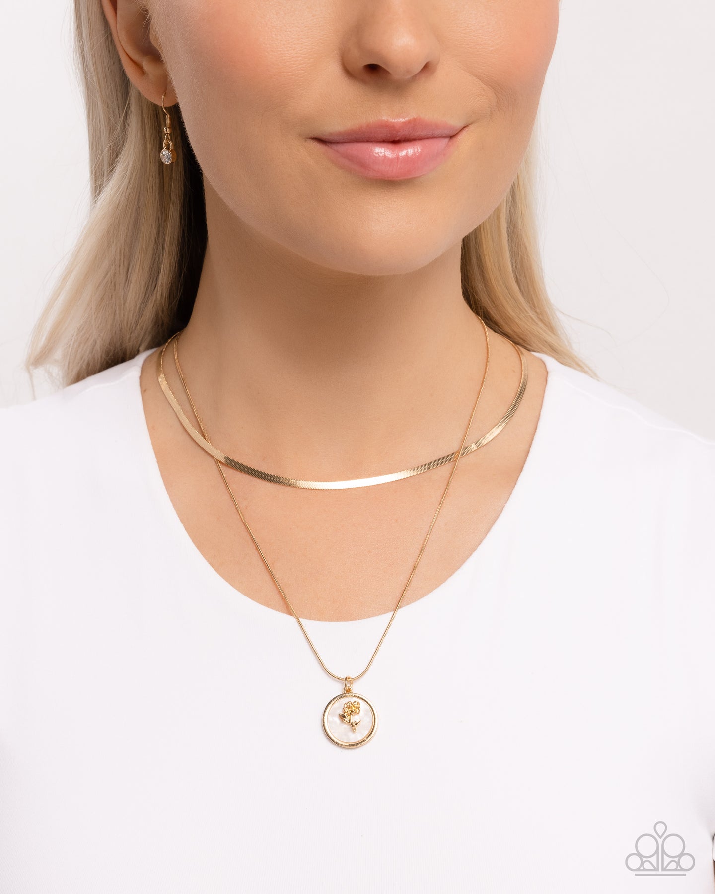 Featured in the center of a white shell, a glistening gold rose pendant glides along a dainty gold chain. A bold gold herringbone chain layers above the rosy display for an additional touch of grit and glitz. Features an adjustable clasp closure.