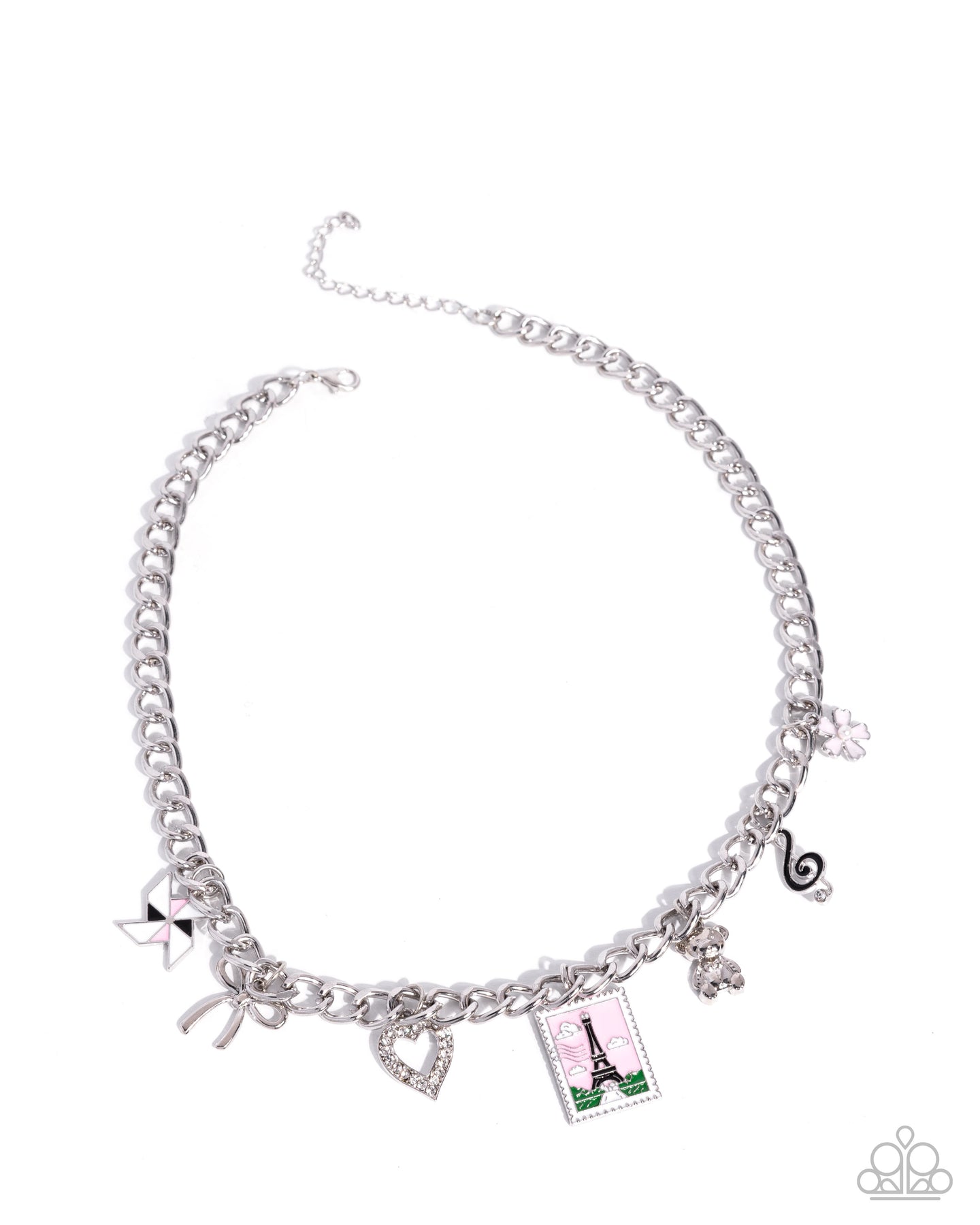 A chunky silver chain is adorned with an eclectic collection of charms, including a black, pink, and white pinwheel, a silver bow, a heart encrusted with white rhinestones, a whimsical Eiffel Tower stamp, a silver teddy bear, a black-painted treble clef, and a dainty pink-painted flower with a pearl center. The variety of charms creates a dynamic and travel-inspired accessory that adds a touch of personality to any outfit. Features an adjustable clasp closure.