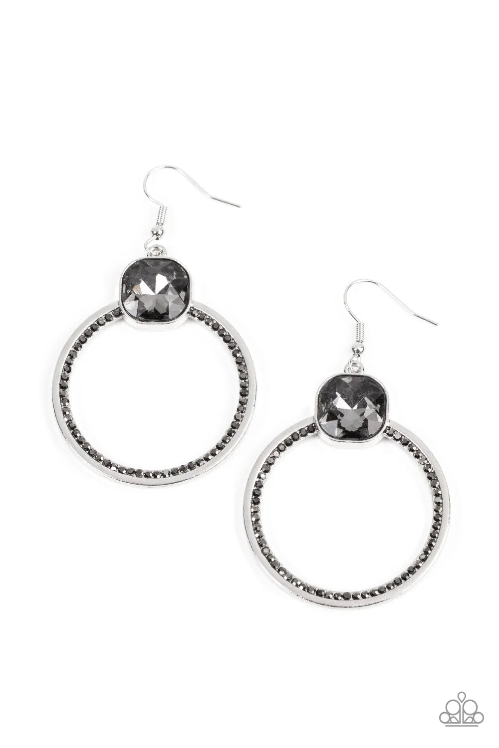 An oversized red gem sits atop a silver hoop with an inner ring encrusted in glitzy white rhinestones, resulting in a timeless twinkle. Earring attaches to a standard fishhook fitting.
