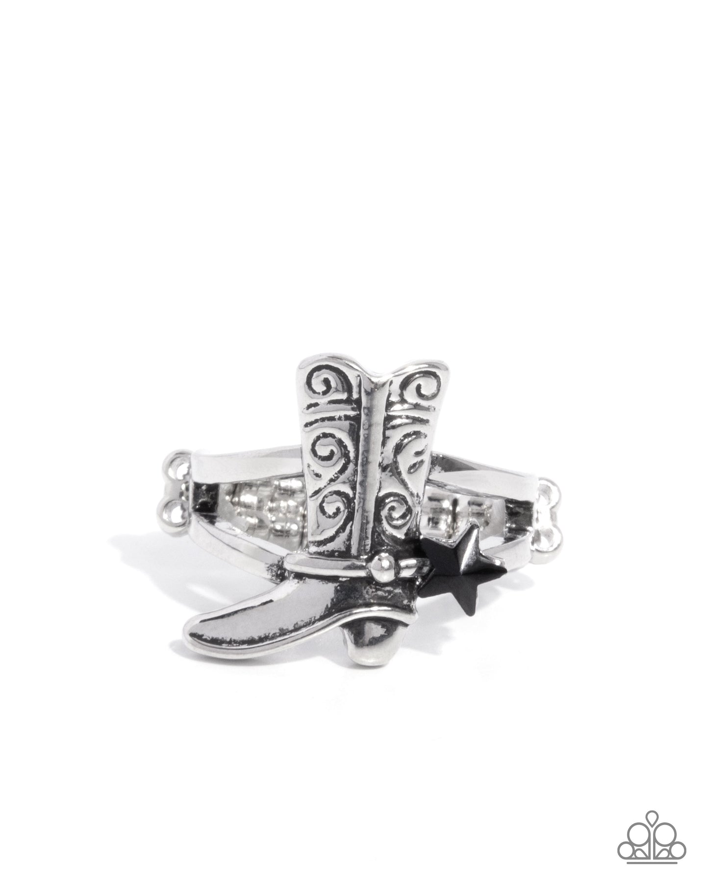 A detailed silver cowboy boot takes center stage atop the finger. A charming black star gem acts as a spur on the heel of the boot for a Western-inspired look. Features a stretchy band for a flexible fit.