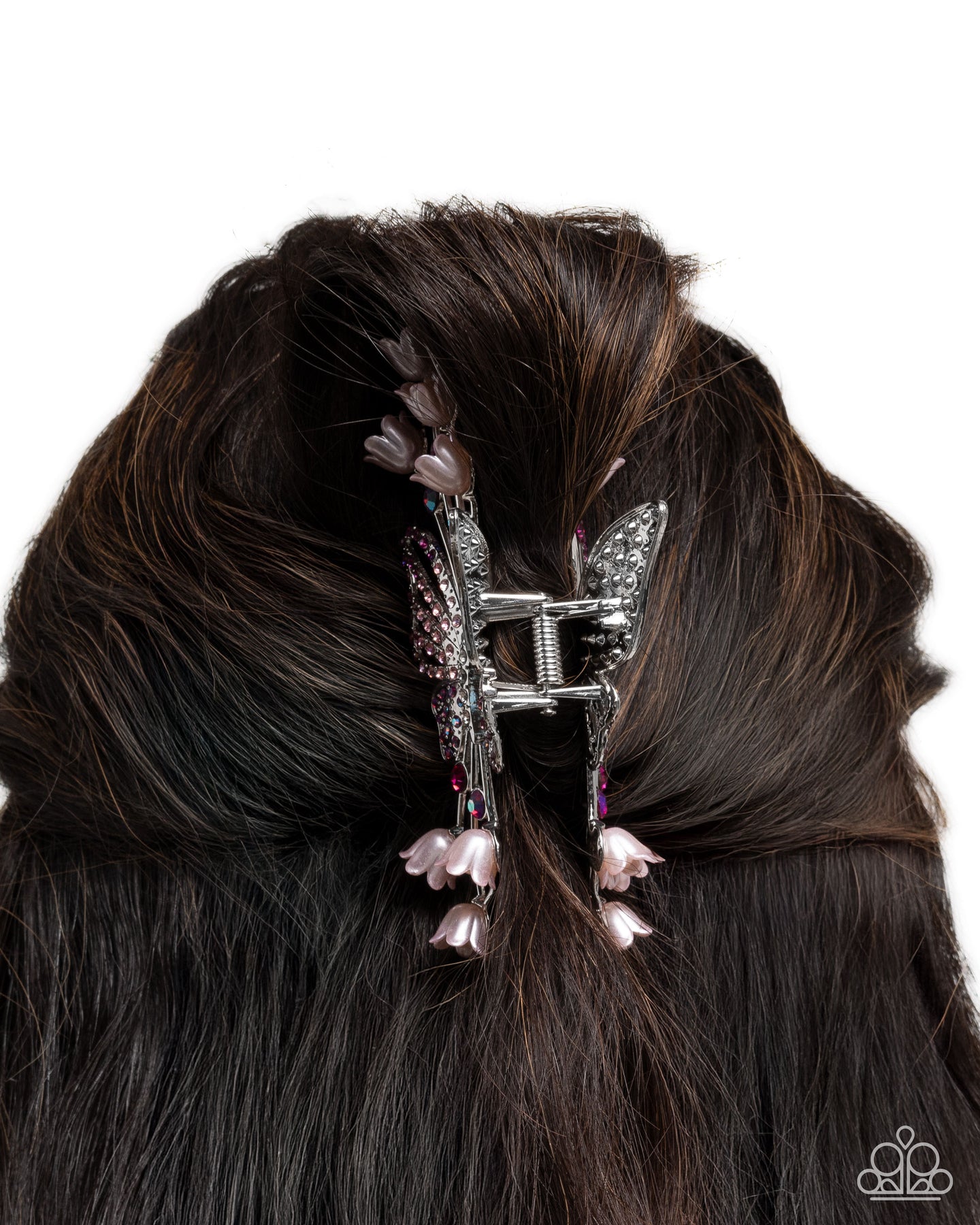 Featuring light rose, fuchsia, white, and fuchsia iridescent rhinestones, a textured silver butterfly claw clip flutters beside baby pink pearl tulips and solitaire fuchsia and fuchsia iridescent rhinestones, holding the hair away from the face for an on-the-go whimsical display. Clip measures approximately 4 1/4" in length and 2 1/4" in width. Due to its prismatic palette, color may vary.