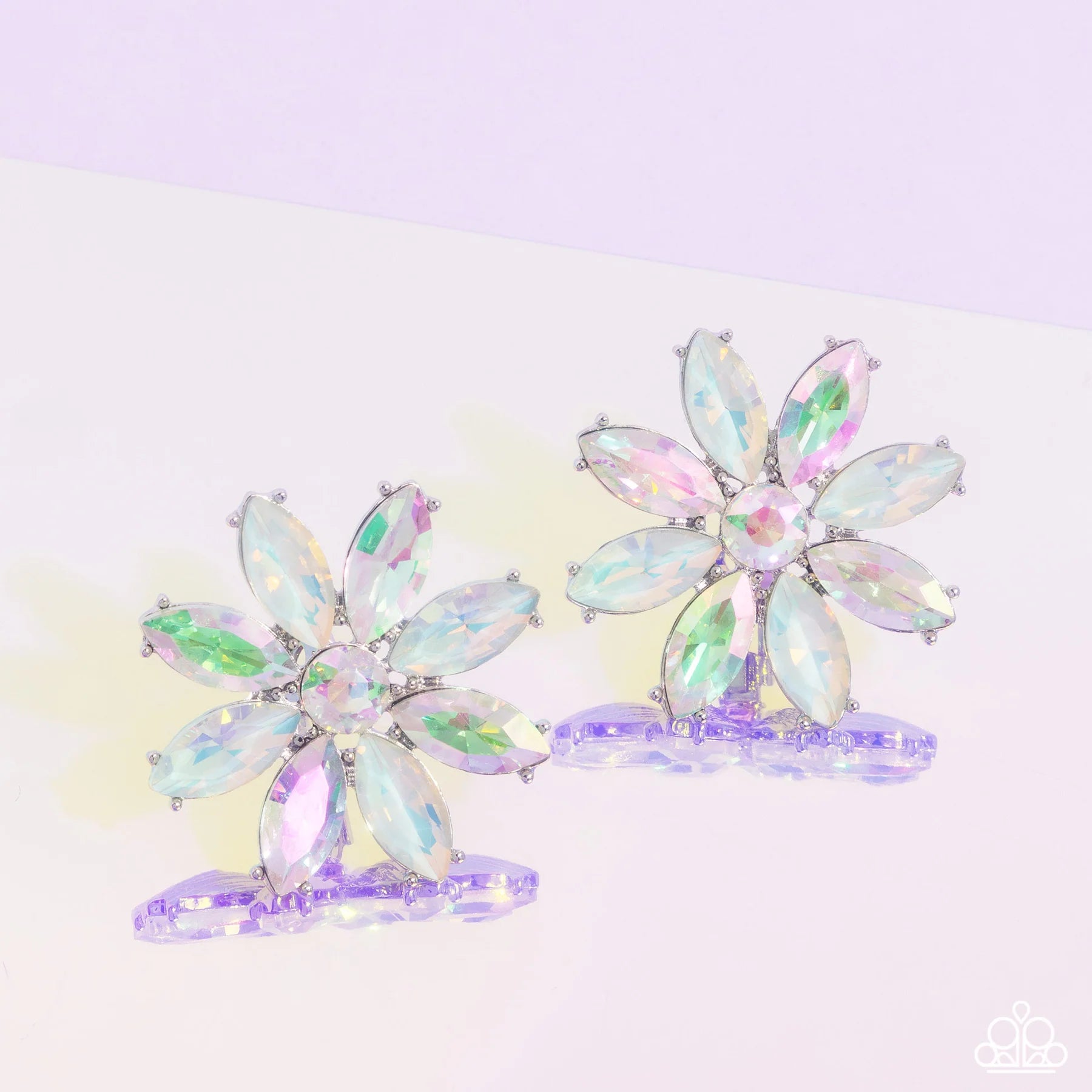 Featuring flashy facets, marquise-cut opalescent green and green UV shimmery petals encircle a round UV shimmery center for a floral, fancy-free look along the ear. Earring attaches to a standard clip-on fitting.