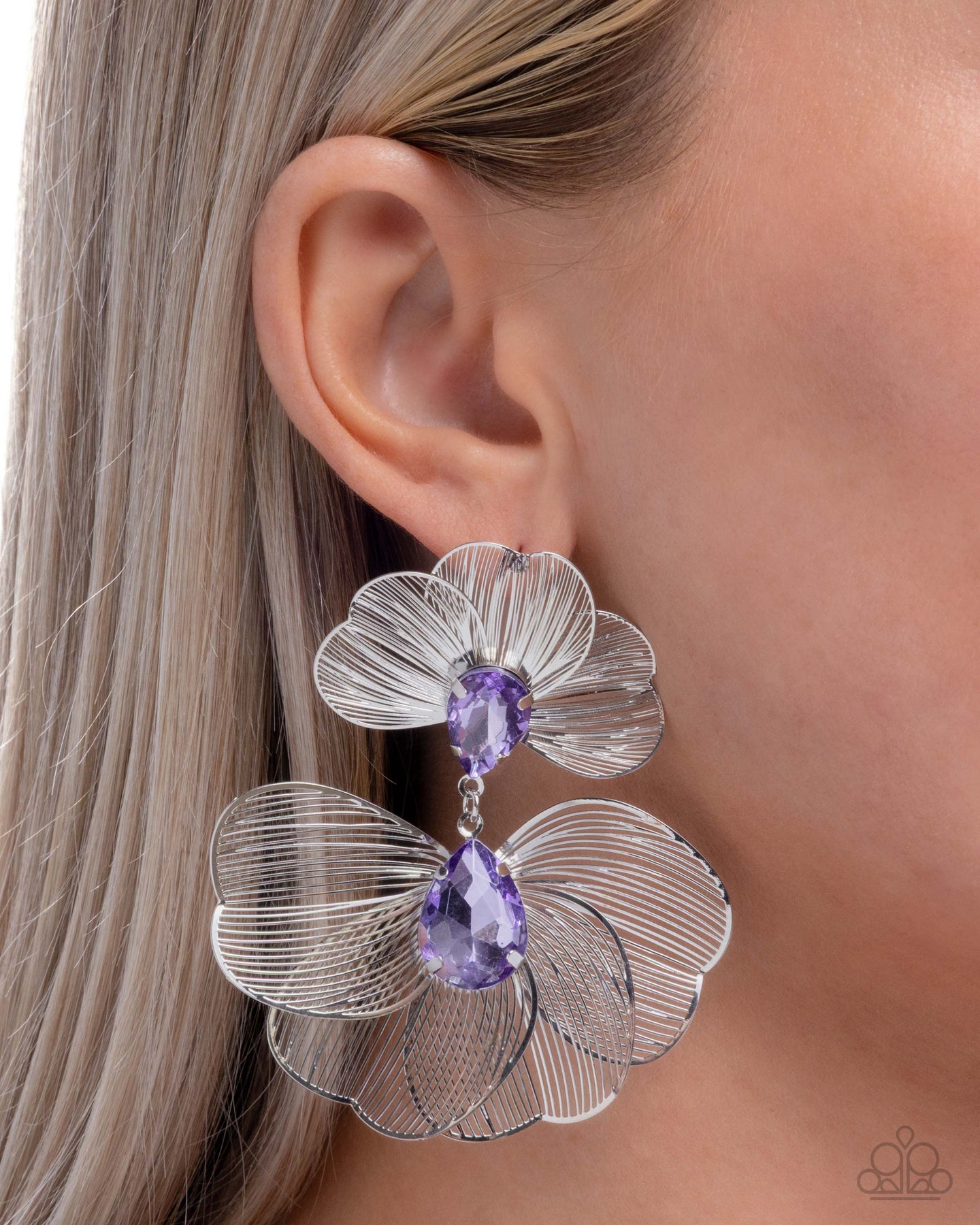Subtle heart-shaped petals molded from shiny silver wire create an airy half flower that blooms from an upside-down purple-pronged gem, giving way to a larger, wiry flower that blooms from a right-side-up purple teardrop gem center for a whimsical lure. Earring attaches to a standard post fitting.