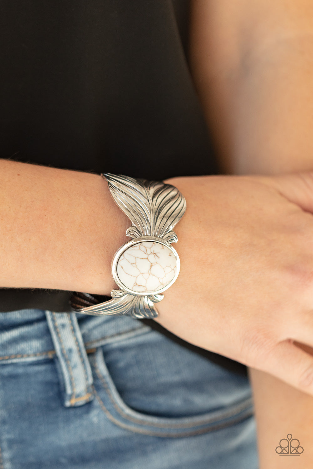 Etched and embossed in lifelike textures, two oversized silver feathers branch out from a refreshing white stone center, curling into a whimsical cuff around the wrist.