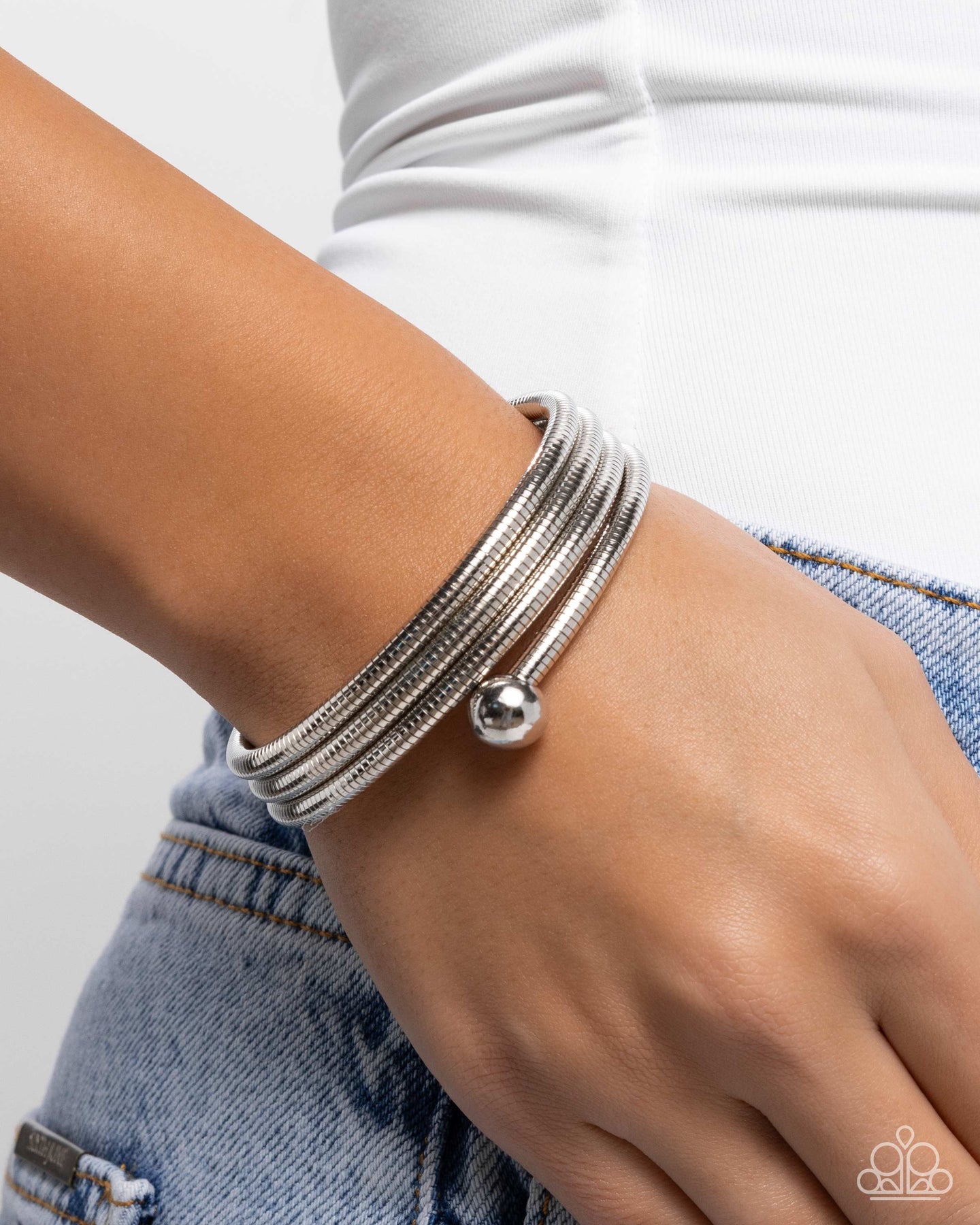 Sleek silver coils stack together to form a chic, metallic bracelet that wraps comfortably around the wrist. The polished beads on each end adds a modern, minimalist touch.