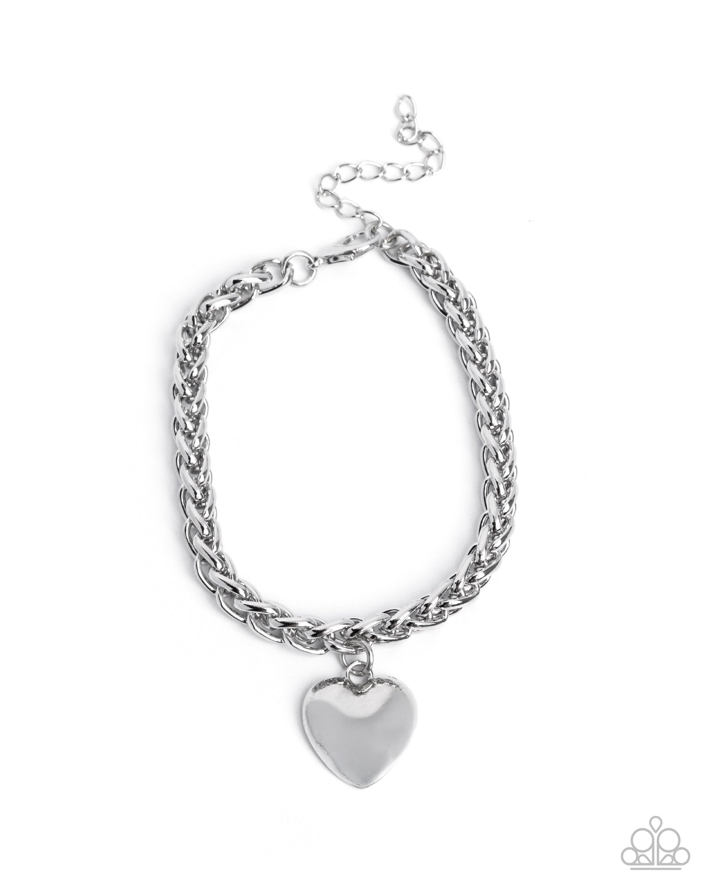Featuring a high sheen, an abstract layered silver chain wraps around the wrist, showcasing its solitaire swinging silver heart pendant for a simply sweet display. Features an adjustable clasp closure.
