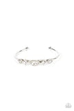 Bordered in glassy white rhinestones, a dainty arrangement of marquise cut rhinestones alternates with tilted square cut rhinestones across the front of a dainty silver cuff for a surprisingly sparkly finish.