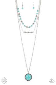 A round turquoise stone, set in a studded antiqued silver frame, creates a bold pendant at the bottom of a lengthened silver chain. This earthy statement piece is accompanied by layered strands of turquoise beads and antiqued silver accents that connect to dainty silver chains making a charming layered design. Features an adjustable clasp closure.