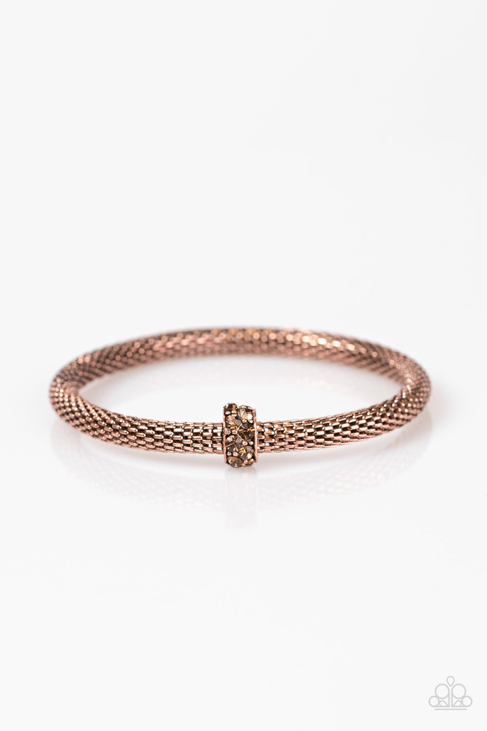 Shimmery copper mesh chain joins into a thick bangle around the wrist. Encrusted in glittery topaz rhinestones, a copper ring slides along the bangle, adding sassy sparkle to the edgy palette.