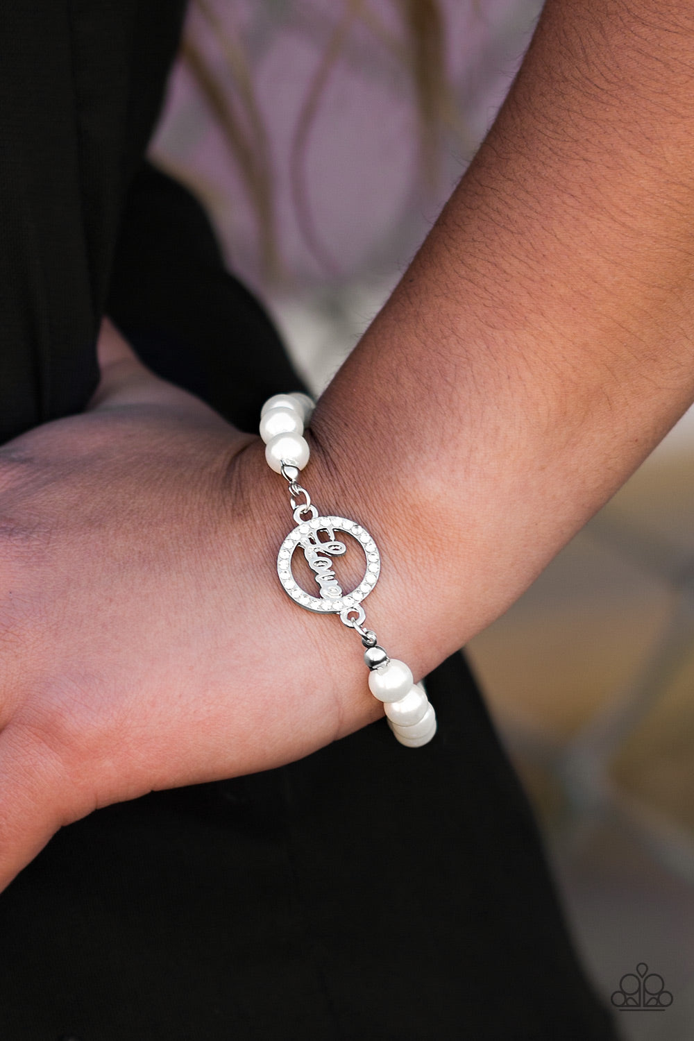 Featuring the word “Love,” a sparkling white rhinestone centerpiece links with classic white pearls around the wrist for a refined fashion. Features an adjustable clasp closure.