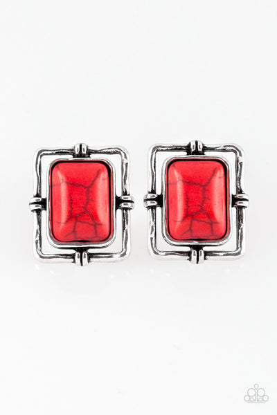 Chiseled into a tranquil rectangle, a fiery red stone is pressed into the center of a hammered silver frame for a seasonal look. Earring attaches to a standard post fitting.