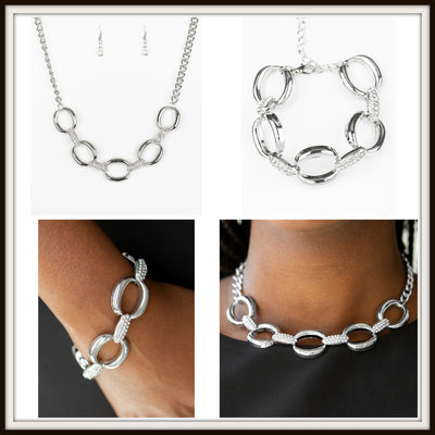 Bold silver links join with white rhinestone encrusted frames below the collar for a fierce look. Features an adjustable clasp closure.