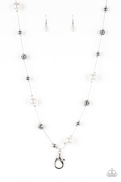 Infused with pearly white accents, classic silver and delicately hammered silver beads trickle along an elegantly elongated silver chain for a refined look. A lobster clasp hangs from the bottom of the design to allow a name badge or other item to be attached. Features an adjustable clasp closure.