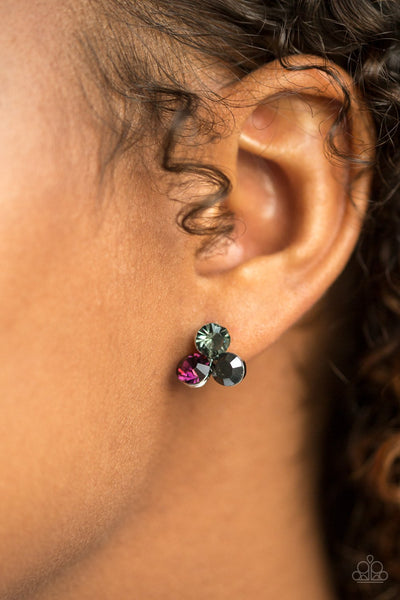 A trio of glowing purple, smoky, and hematite rhinestones coalesce into a timeless frame. Earring attaches to a standard post fitting. Paparazzi Accessories
