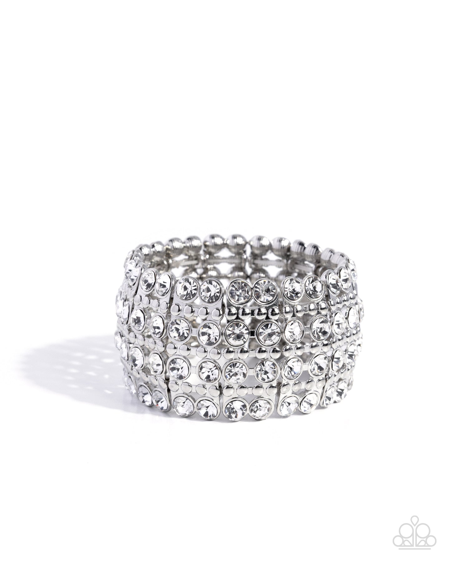 Pressed in silver fittings, a collection of white rhinestones and a quartet of silver studs sparkles atop interconnected silver plates along elastic stretchy bands around the wrist for a jaw-dropping dazzle.