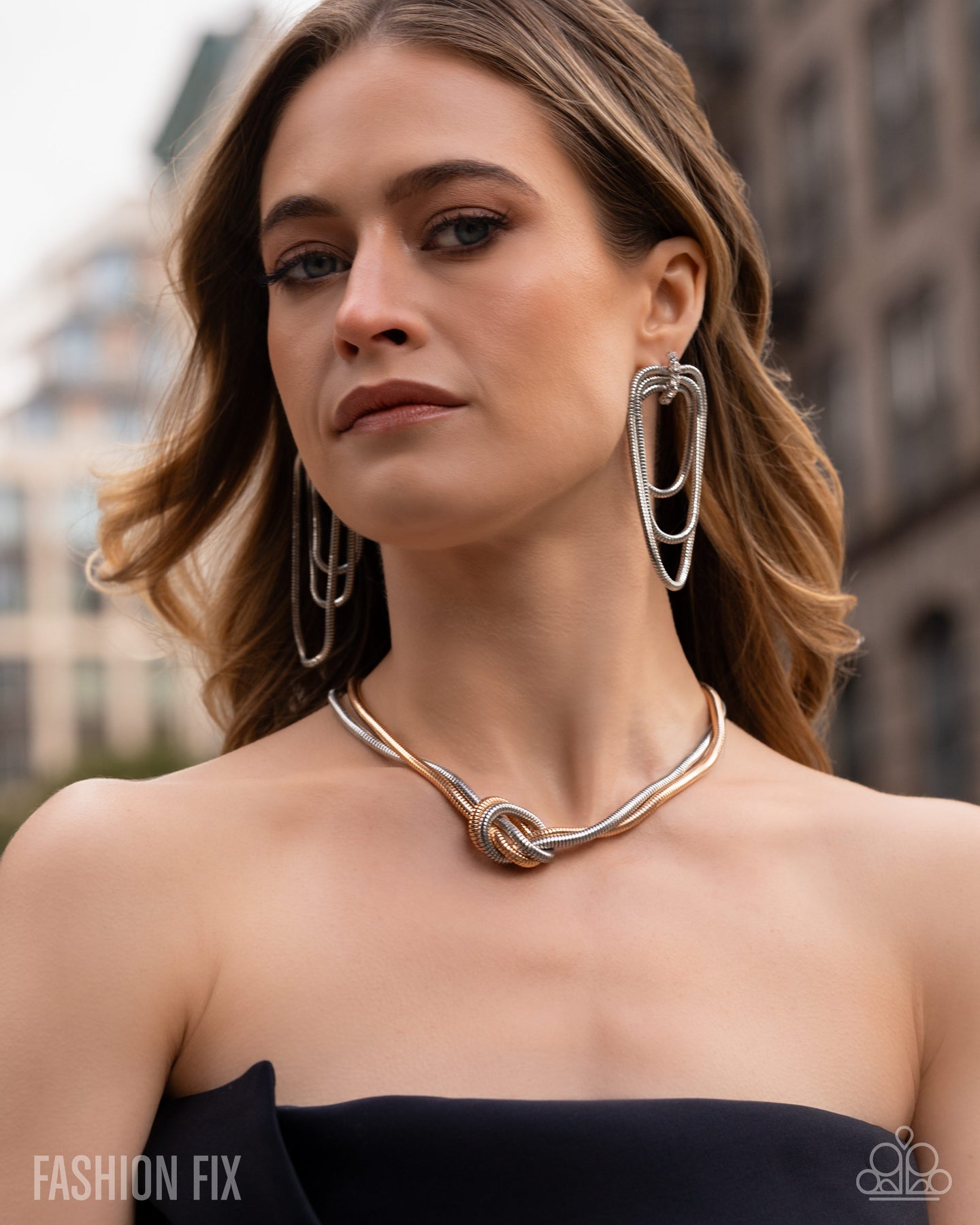 Two thick rows of snake chains in gold and silver hues knot into a bold centerpiece below the neckline for an iconic, industrial look. Features an adjustable clasp closure.