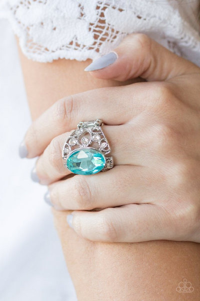 A glassy white gem sits atop a frilly filigree backdrop radiating with glassy white rhinestones for a regal look. Features a stretchy band for a flexible fit.