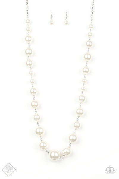A strand of white pearls capped in silver swing boldly from the bottom of a silver chain. The varying sizes and haphazard placement brings a dramatic new twist to a timeless classic. Features an adjustable clasp closure.