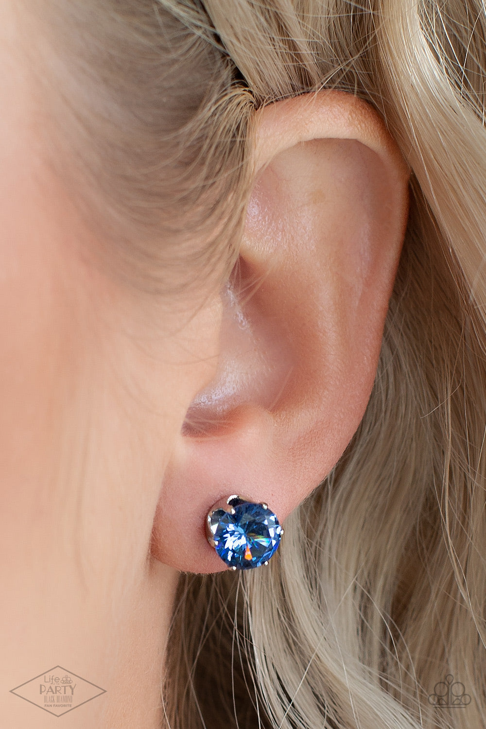 A glassy blue rhinestone is nestled inside of a shimmery silver frame for a timeless look. Earring attaches to a standard post fitting.