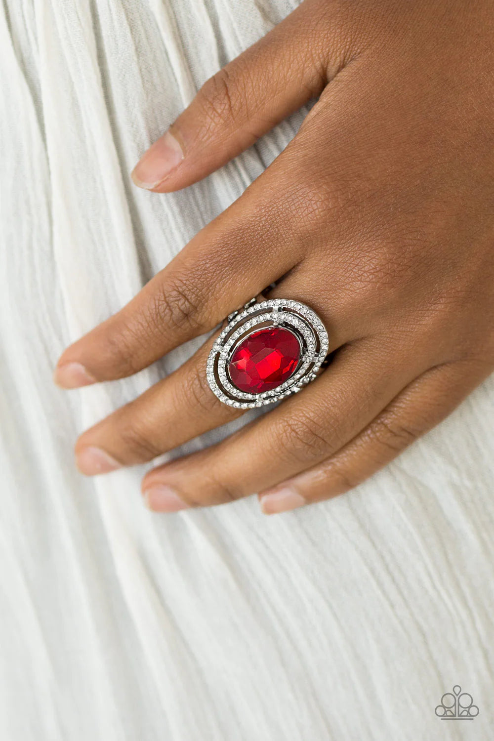 A glittery black gem sits atop stacked silver frames radiating with glassy white rhinestones for a timeless look. Features a stretchy band for a flexible fit.~Sold as one individual ring. Paparazzi Accessories