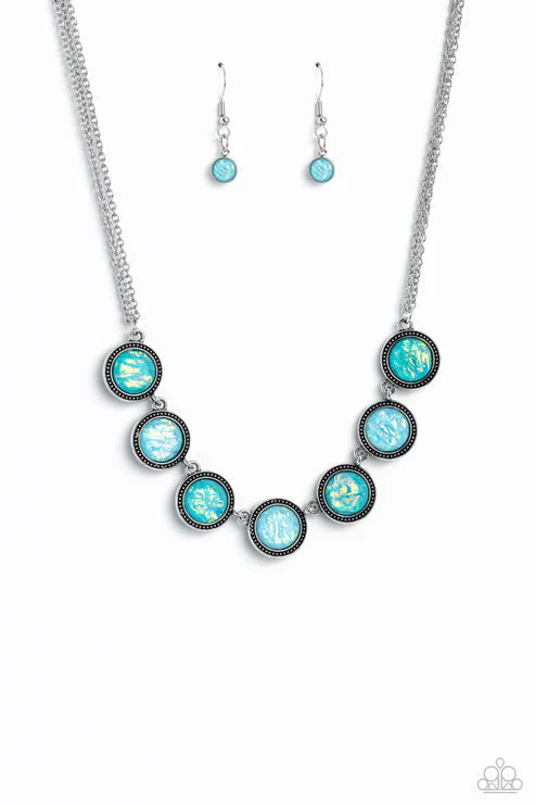 Suspended between dainty layers of silver chain, a collection of glassy blue gems featuring a refracted shimmer and an opalescent finish link along the collar to create a hypnotic pop of color. Each gem is pressed into a silver studded frame with ornate flowers on its back, infusing the design with double-sided wearable whimsicality. Due to its prismatic palette, color may vary.