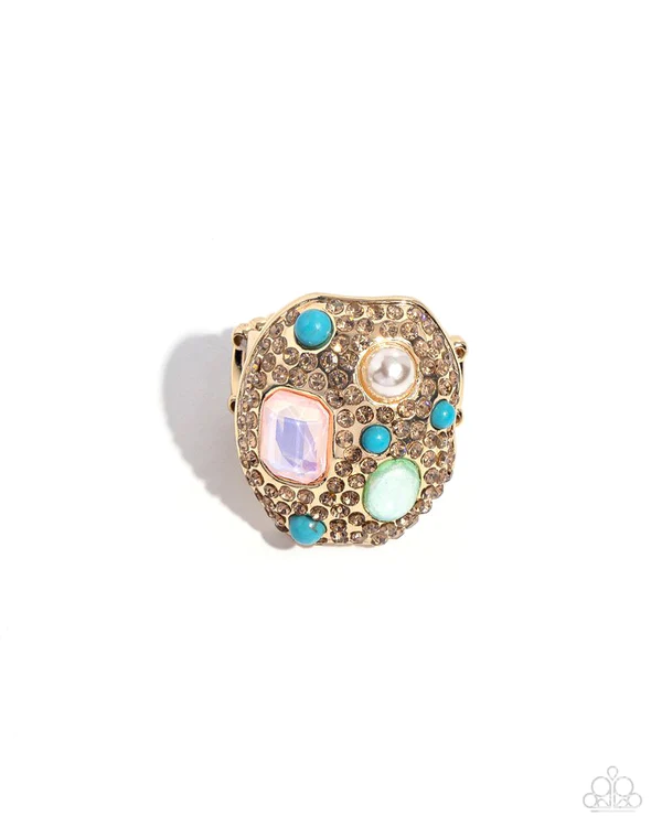 Embellished in light-colored topaz rhinestones, an oval abstract gold ring glitters atop the finger. Turquoise beads, a white pearl, an emerald-cut pink iridescent gem, and a green opalescent oval bead create additional color and shine. Features a stretchy band for a flexible fit. Due to its prismatic palette, color may vary.