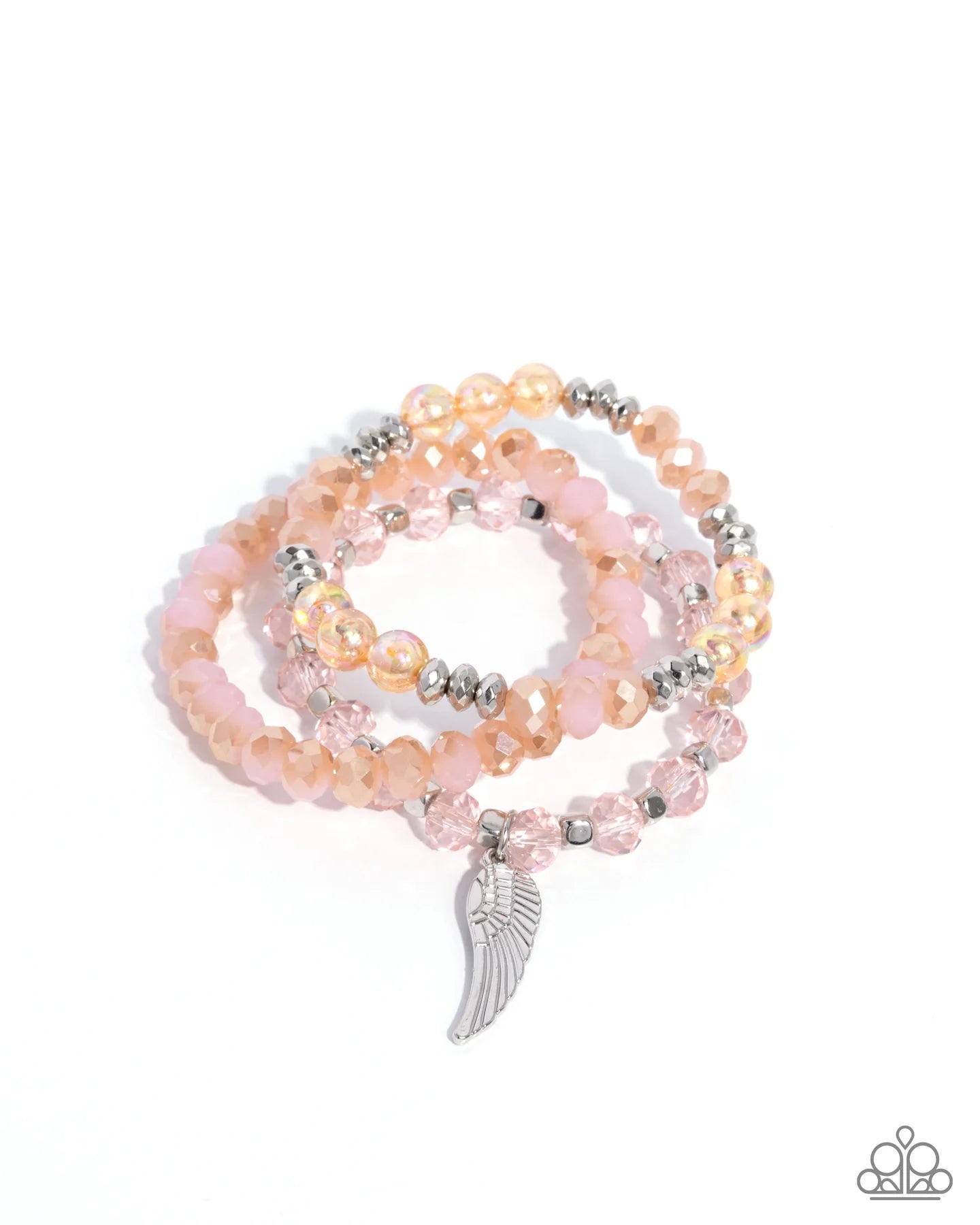 A trio of stretchy bands are adorned with faceted and smooth beads in a gradient of peachy pink hues and accented with silver beads. A dangling silver angel wing adds a whimsical touch to the design.