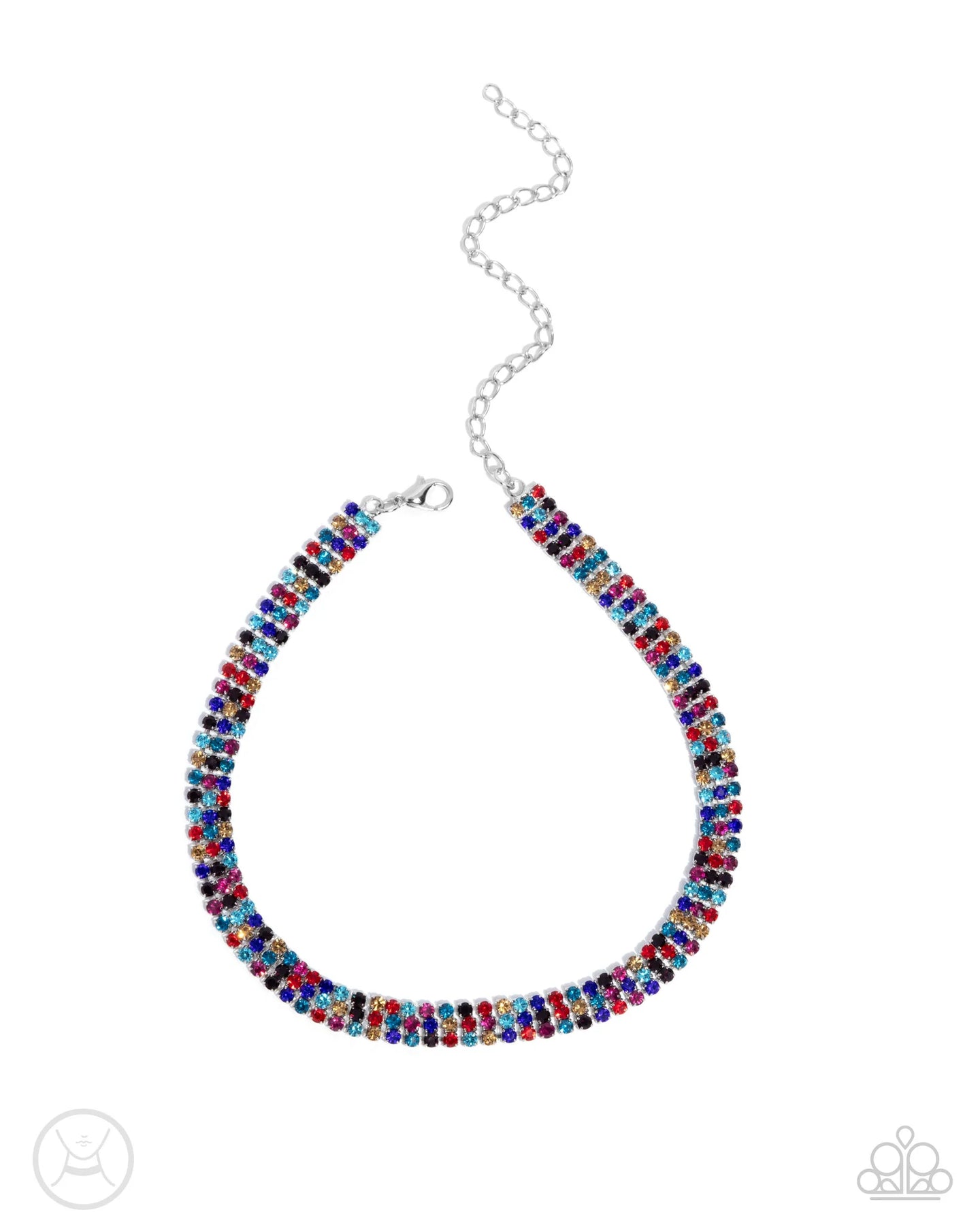 Featuring sleek square fittings, strands of glittery multicolored crystal-like and faceted rhinestones coalesce into a regal display around the neck. Features an adjustable clasp closure.