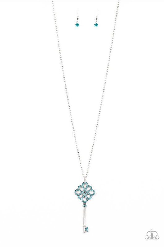 Item #P2RE-PKXX-264XX Encrusted in dazzling pink rhinestones, a shimmery silver key pendant swings from the bottom of a lengthened silver chain for a vintage inspired look. Features an adjustable clasp closure. Sold as one individual necklace. Includes one pair of matching earrings.
