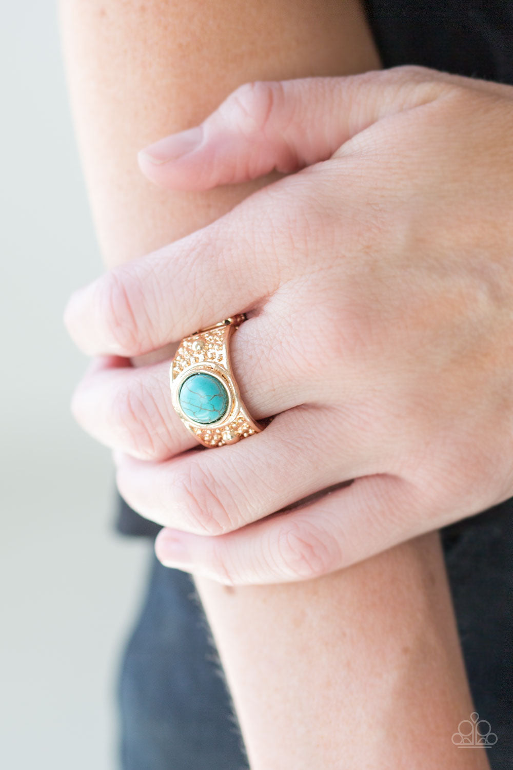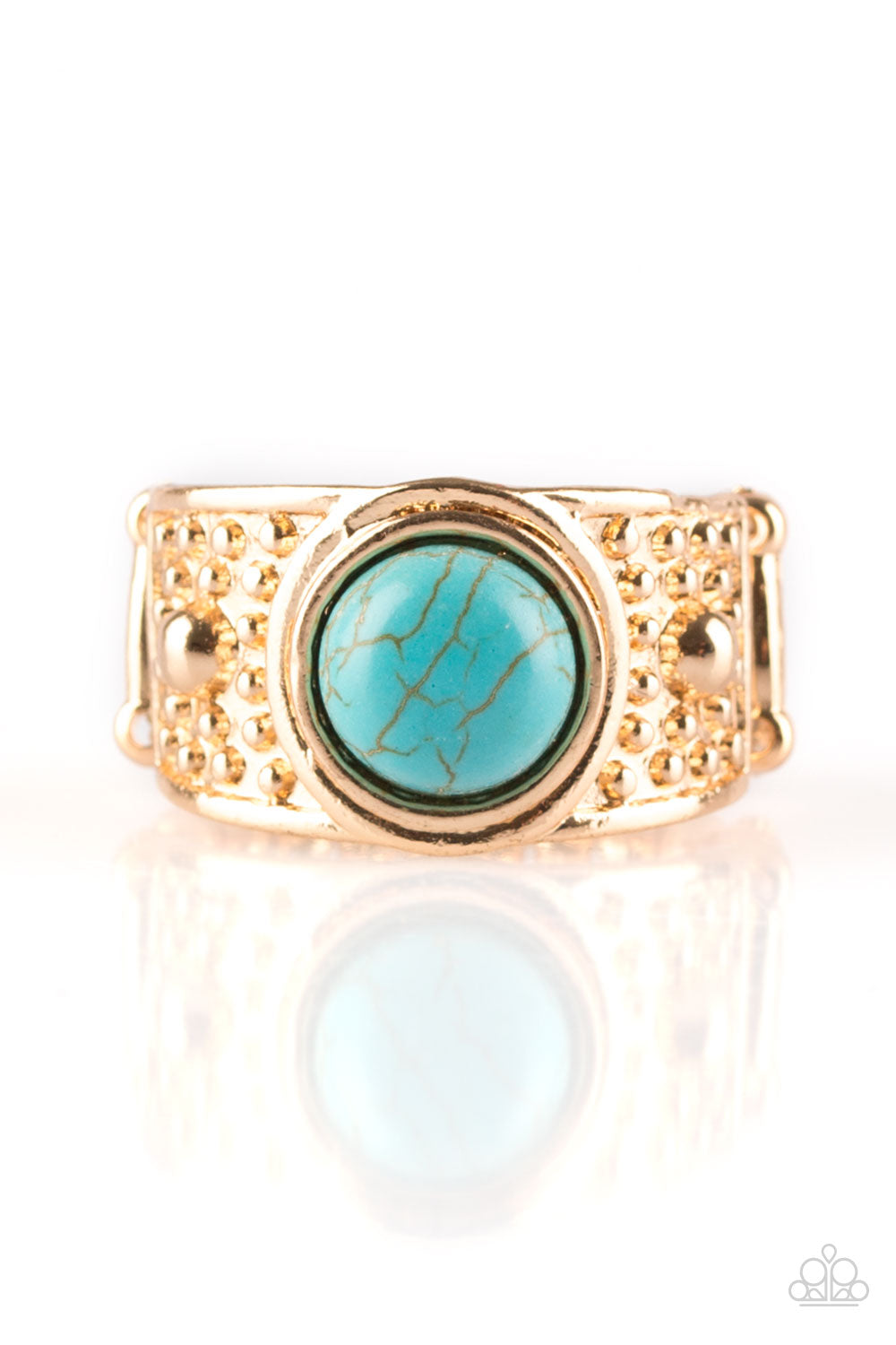 A refreshing turquoise stone is pressed into the center of a shiny gold frame radiating with studded textures for an artisan inspired look. Features a stretchy band for a flexible fit.