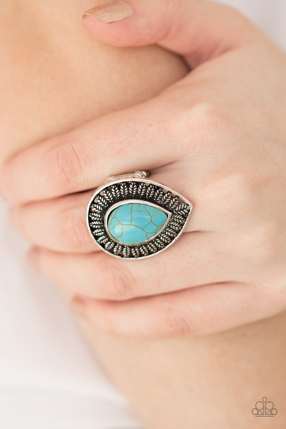 Chiseled into a tranquil teardrop, an earthy turquoise stone is pressed into a silver frame radiating with leafy foliage. Features a stretchy band for a flexible fit.