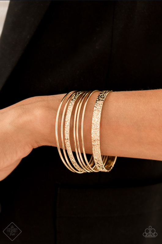 Brushed in a high-sheen shimmer, a collection of smooth and heavily textured gold bangles slides up and down the wrist for an edgy stacked look.