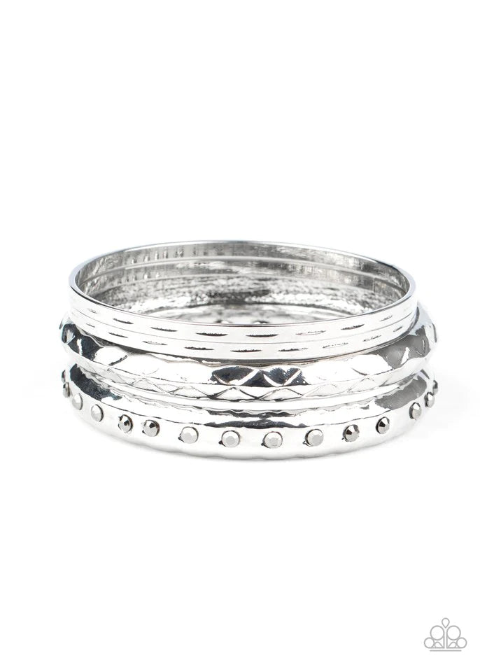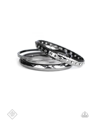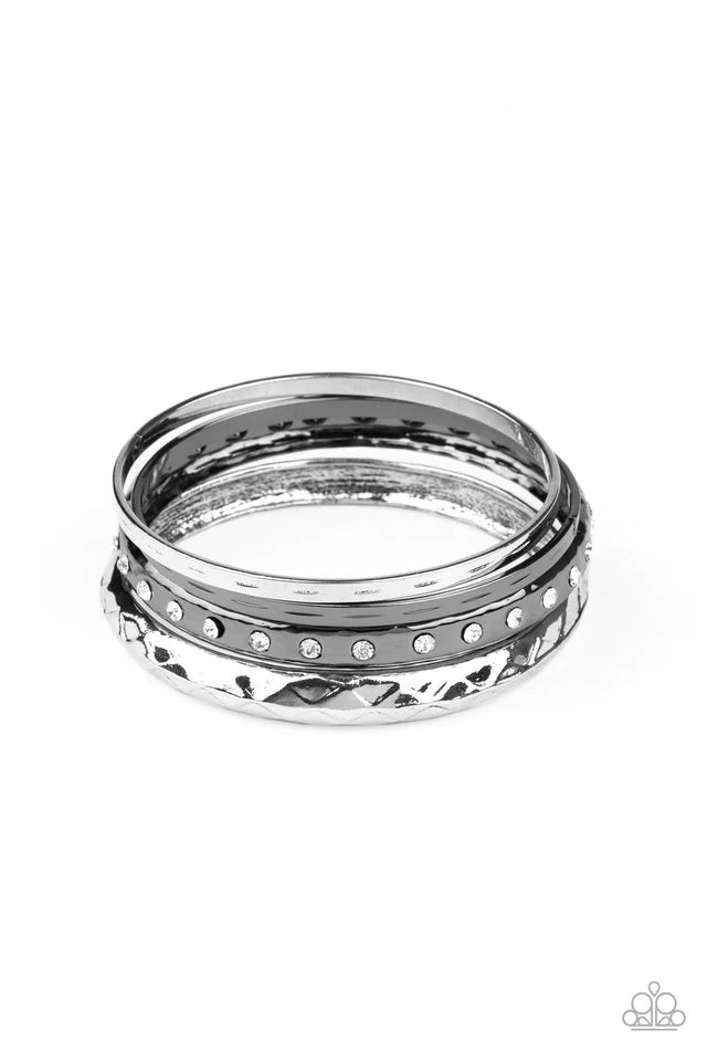 A stack of gunmetal bangles is hammered in texture, creating light-catching edges that reflect an immense amount of shine. One bangle is lined with glassy white rhinestones, adding a hint of twinkle.