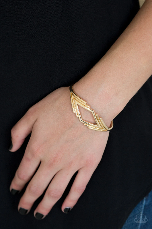 Brushed in a high-sheen finish, glistening V-shaped frames join into a dainty cuff. The airy center allows the skin to peek beneath the geometric frame for a natural finish.