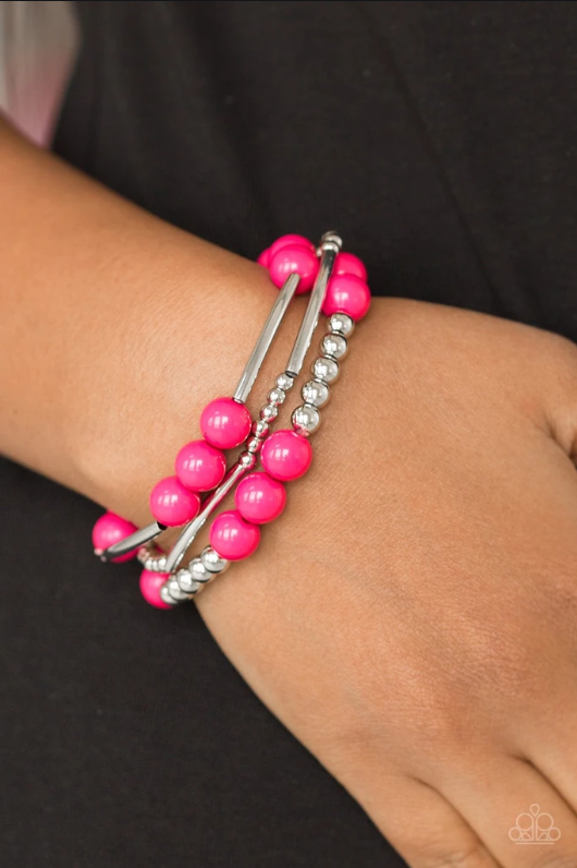 Polished blue beads and mismatched silver beads are threaded along stretchy bands, creating colorful layers across the wrist. Paparazzi Accessories