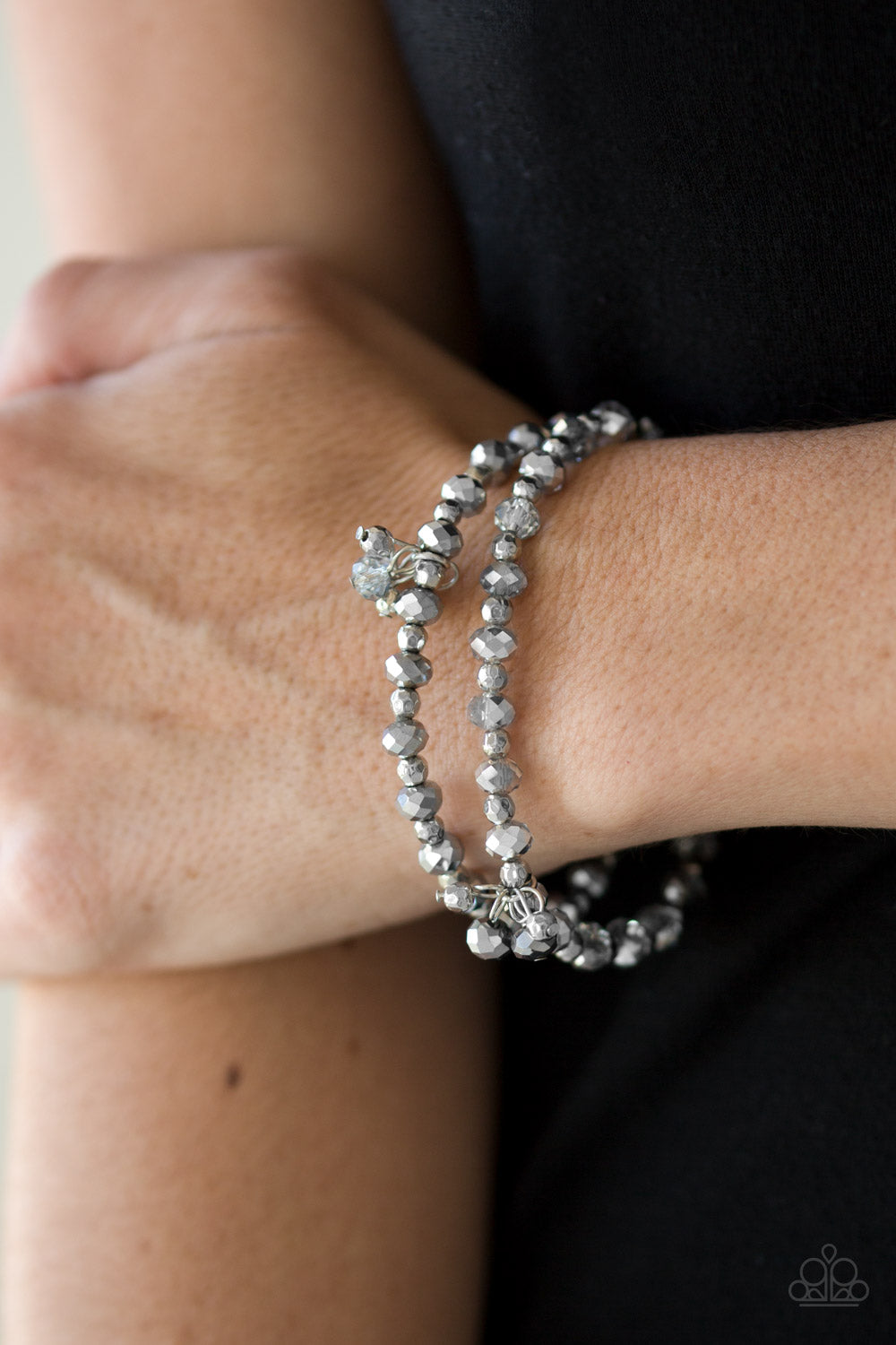 Hematite and smoky crystal-like beads and faceted silver beads are threaded along stretchy elastic bands. Matching gunmetal beads swing from the wrist, creating clustered centerpieces.~ ~Sold as one set of two bracelets. Paparazzi Accessories